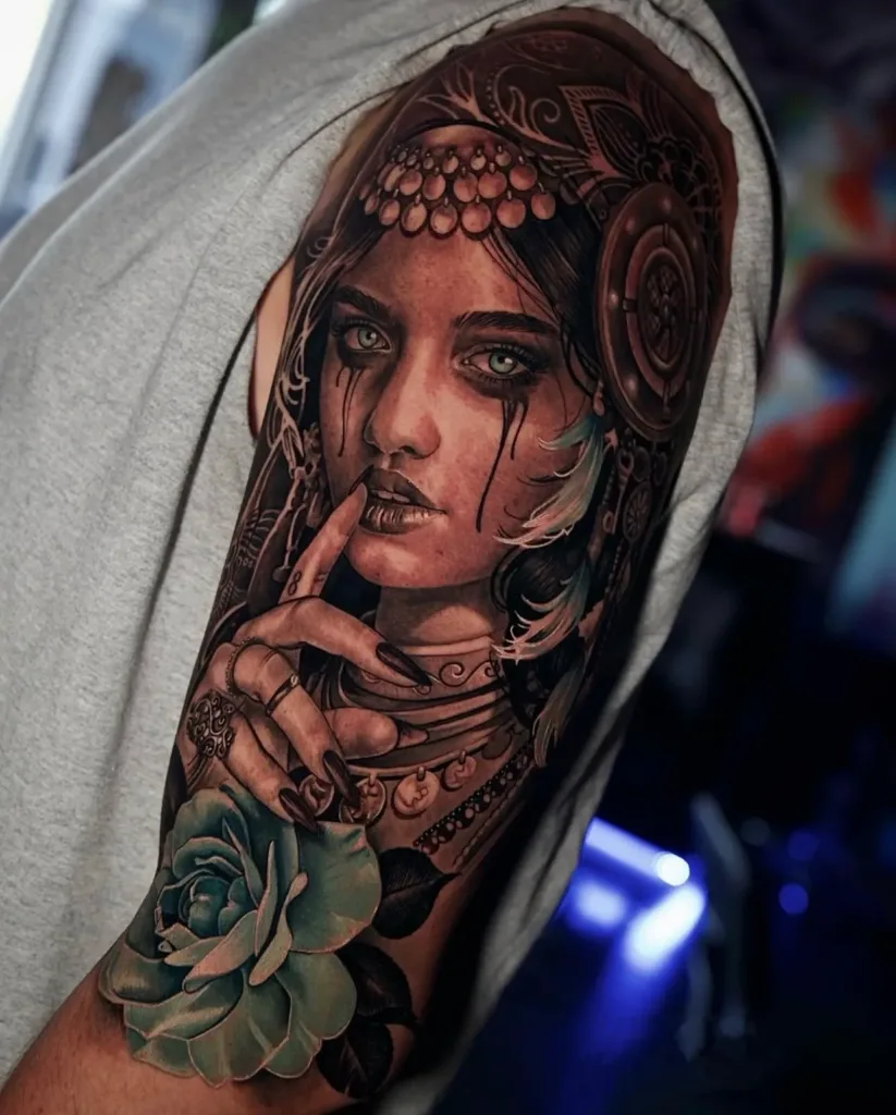 an image of a woman with red and plink flowers on her head showcasing realism tattoo artist in Tampa
